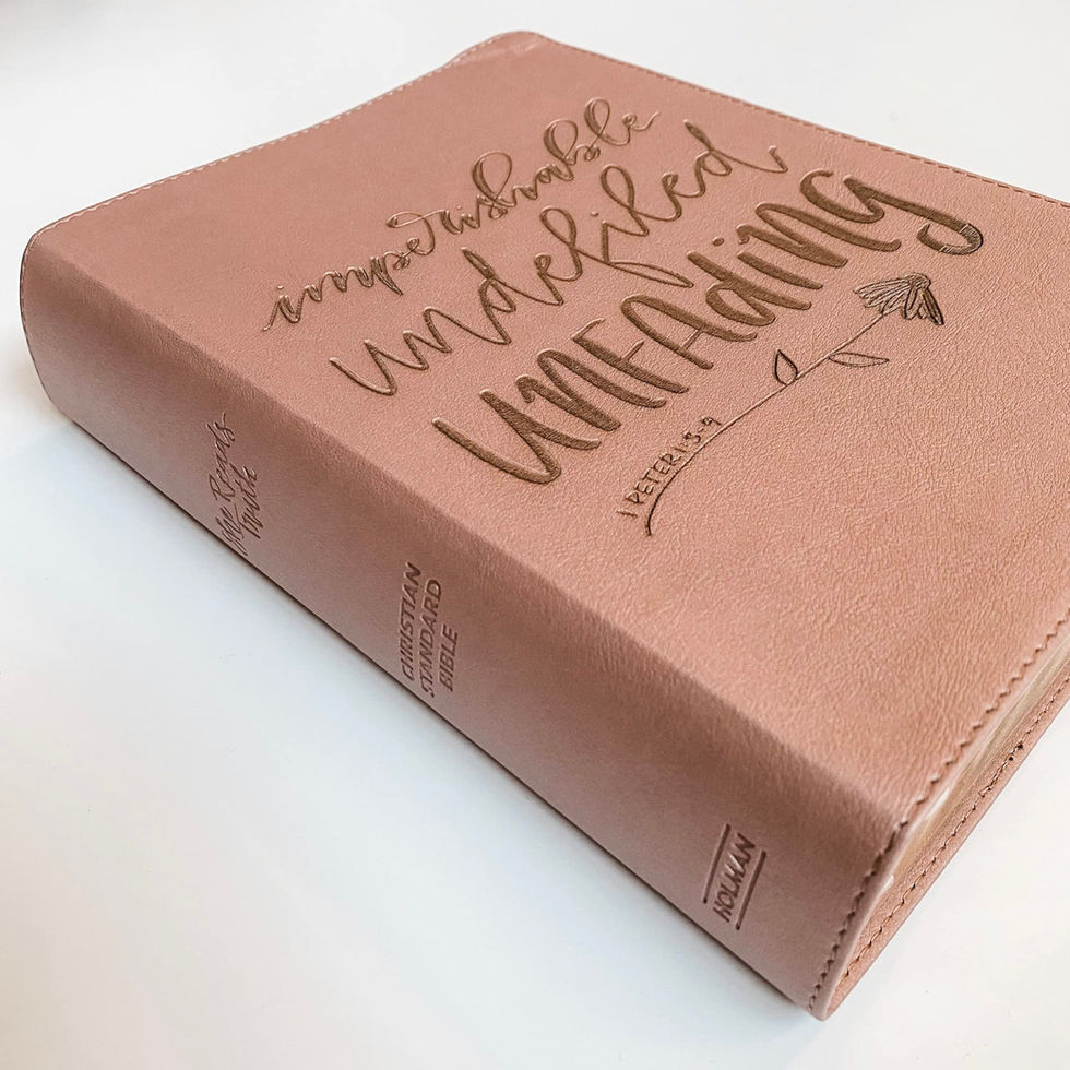 This is a rose gold CSB She Reads Truth Bible with. Features hand lettered engraving of some key words from 1 Peter: "Imperishable, Undefiled, Unfading" with a rose.