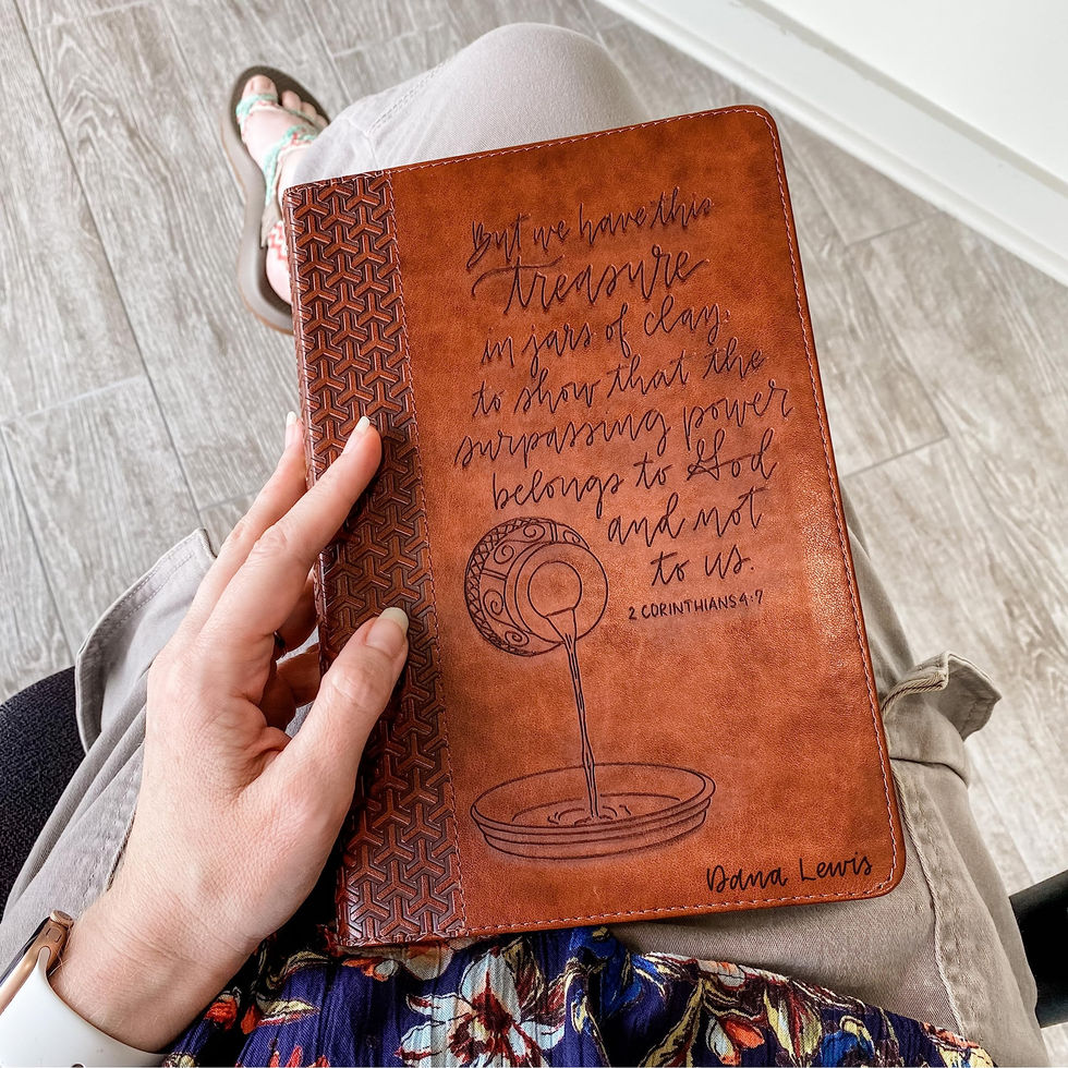 This is a Two-Tone Brown CSB Study Bible with 2 Corinthians 4:7 - "But we have this treasure in jars of clay to show that the surpassing power belongs to God and not to us."