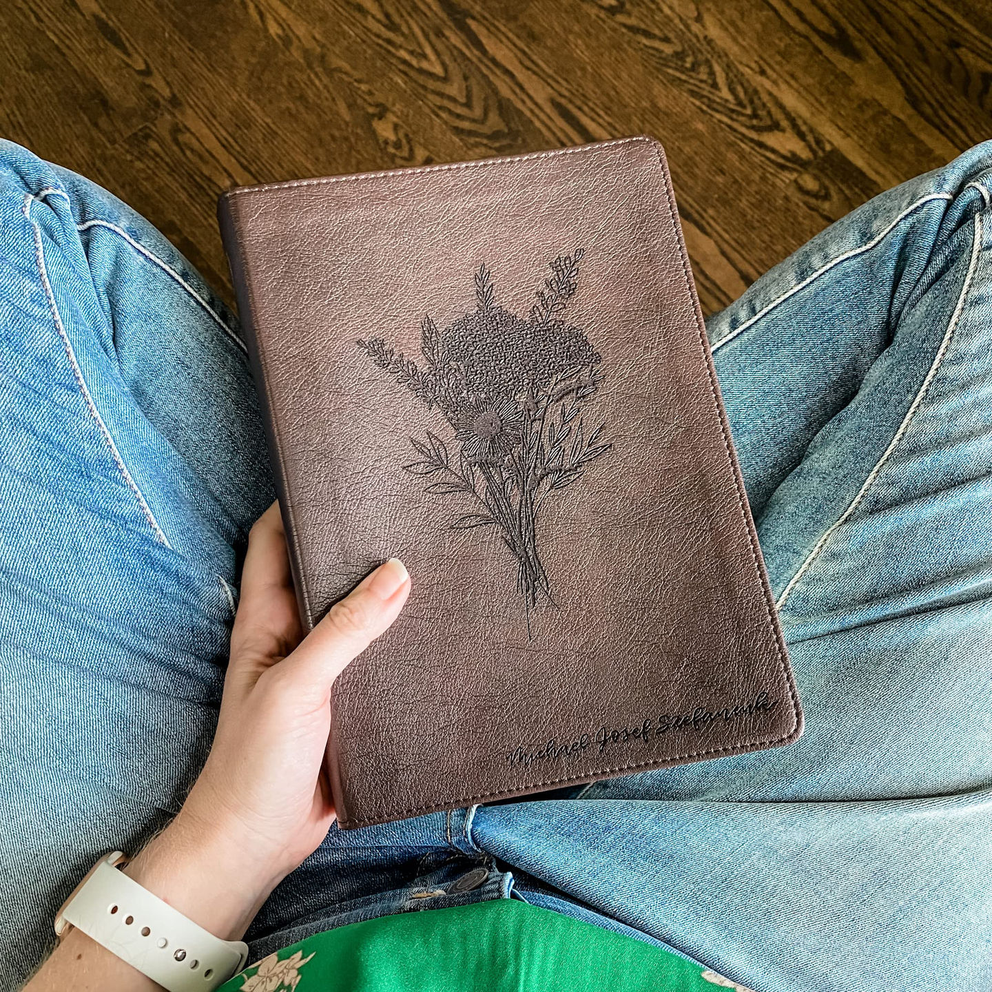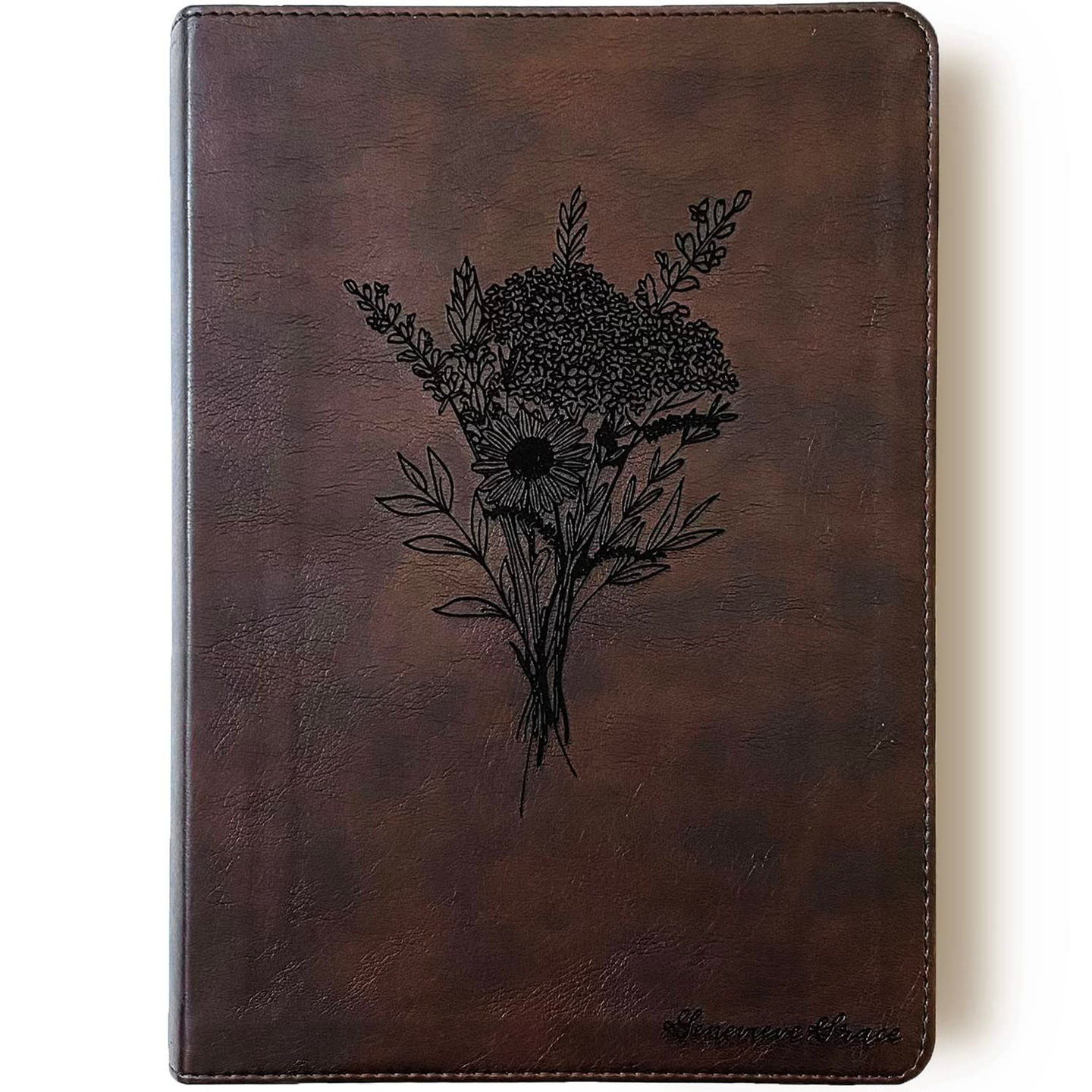 This is a brown ESV journaling Bible. Features Hand Illustrated Flower Bouquet and a hand lettered name of your choice. Your purchase includes the option to add personalized name engraved on the front cover.