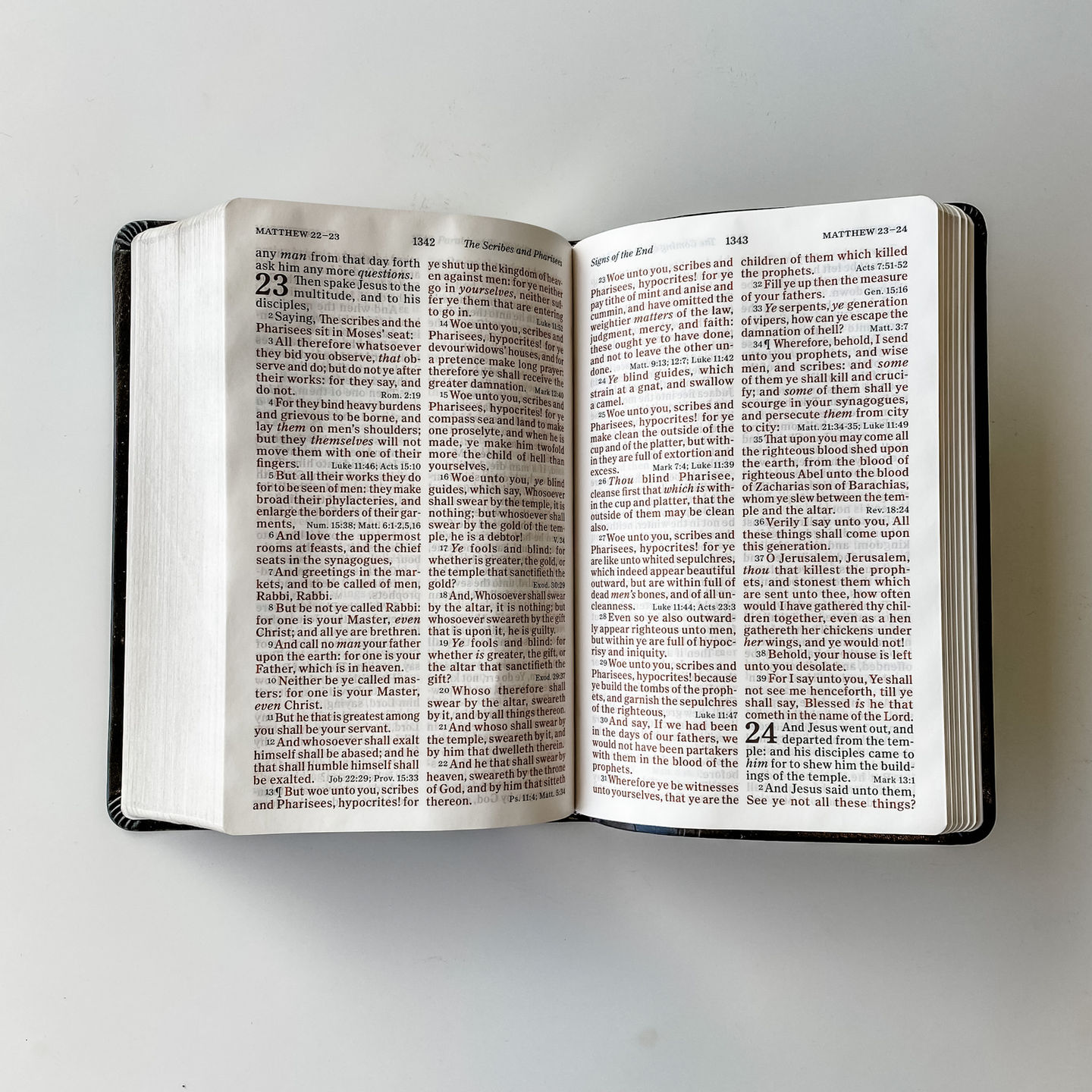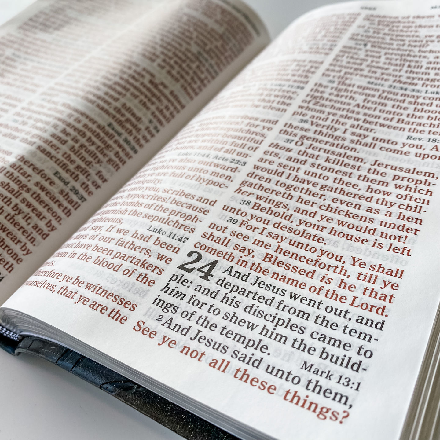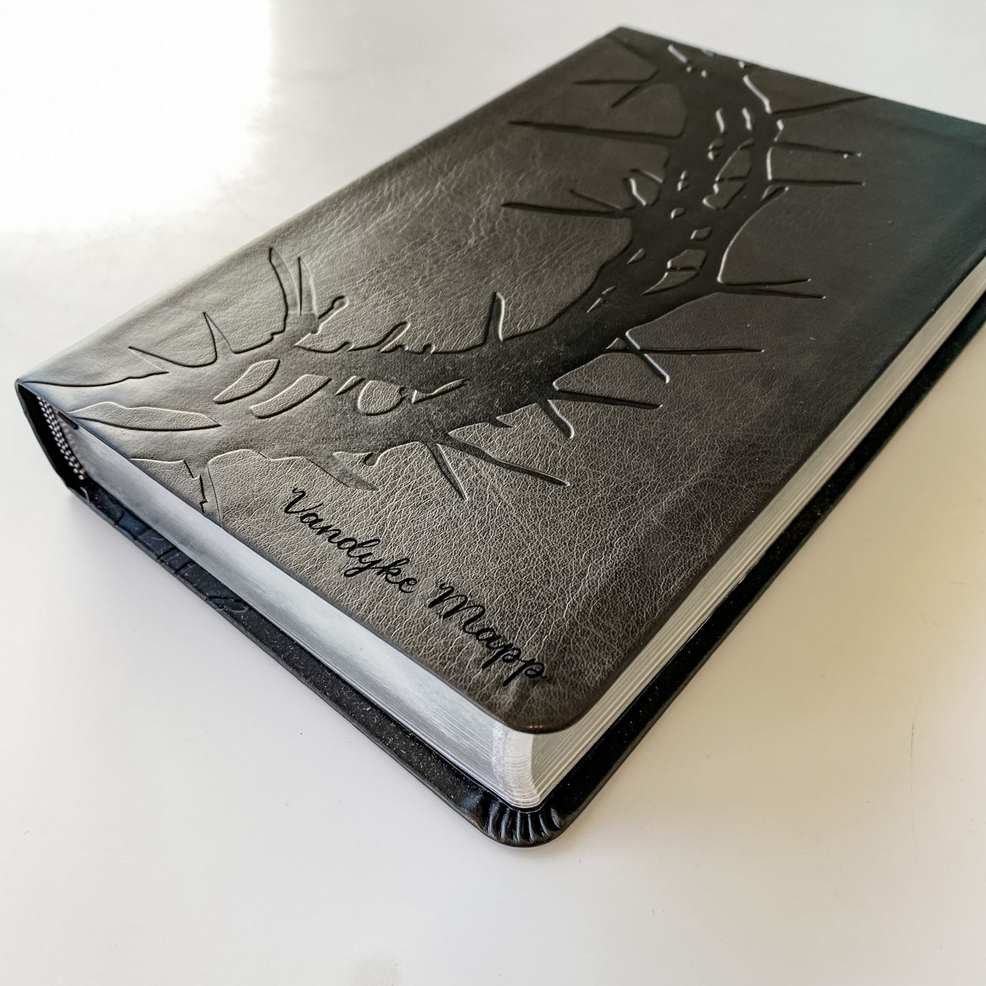 This is a personal size, large print, black KJV reference Bible with a crown of thorns that extends from front to back cover (and over the spine). Purchase includes the ability to customize with a personalized, hand lettered name added to the lower right corner of the front cover.