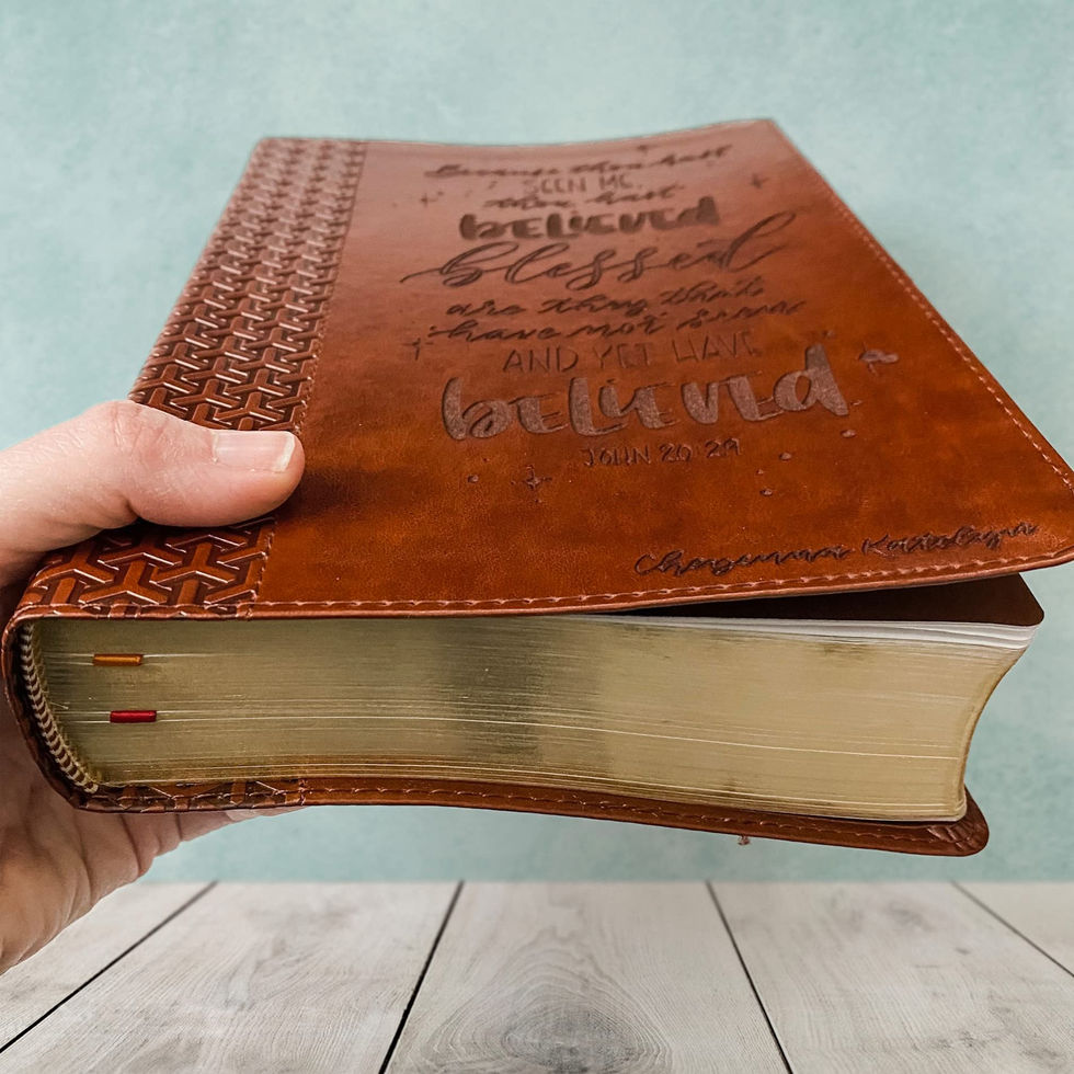 The photos are samples only and I can engrave this Bible with any design, verse or wording that you desire. For inspiration and potential design ideas, be sure to check out This Gallery and follow my Instagram Page.