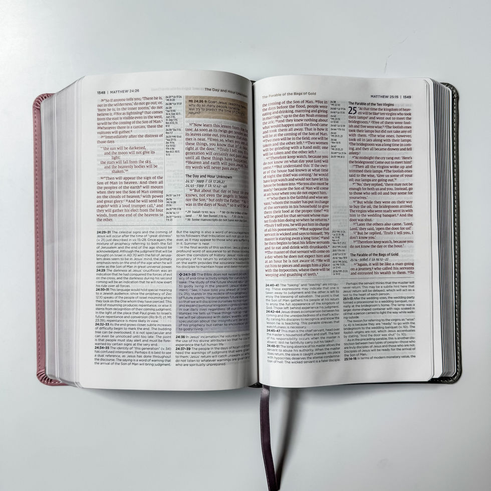 This is a pink and gray NIV Application Study Bible. Your purchase includes the ability to customize with a personalized, hand lettered name engraved on the lower right corner of the front cover.