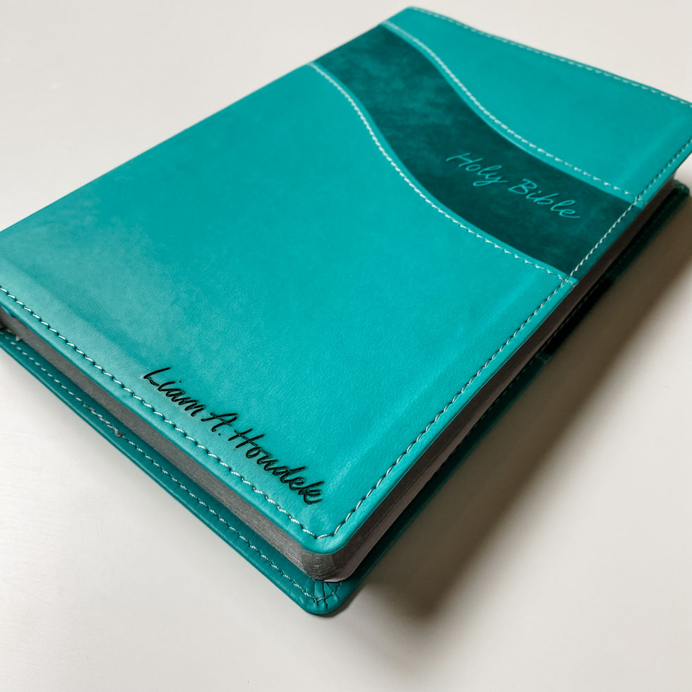 This is a two-tone teal NIV gift Bible, personal sized. Front cover includes a "wave" in a darker green with "Holy Bible" written within it. Your purchase includes the ability to customize with a personalized, hand lettered name engraved on the lower right corner of the front cover.