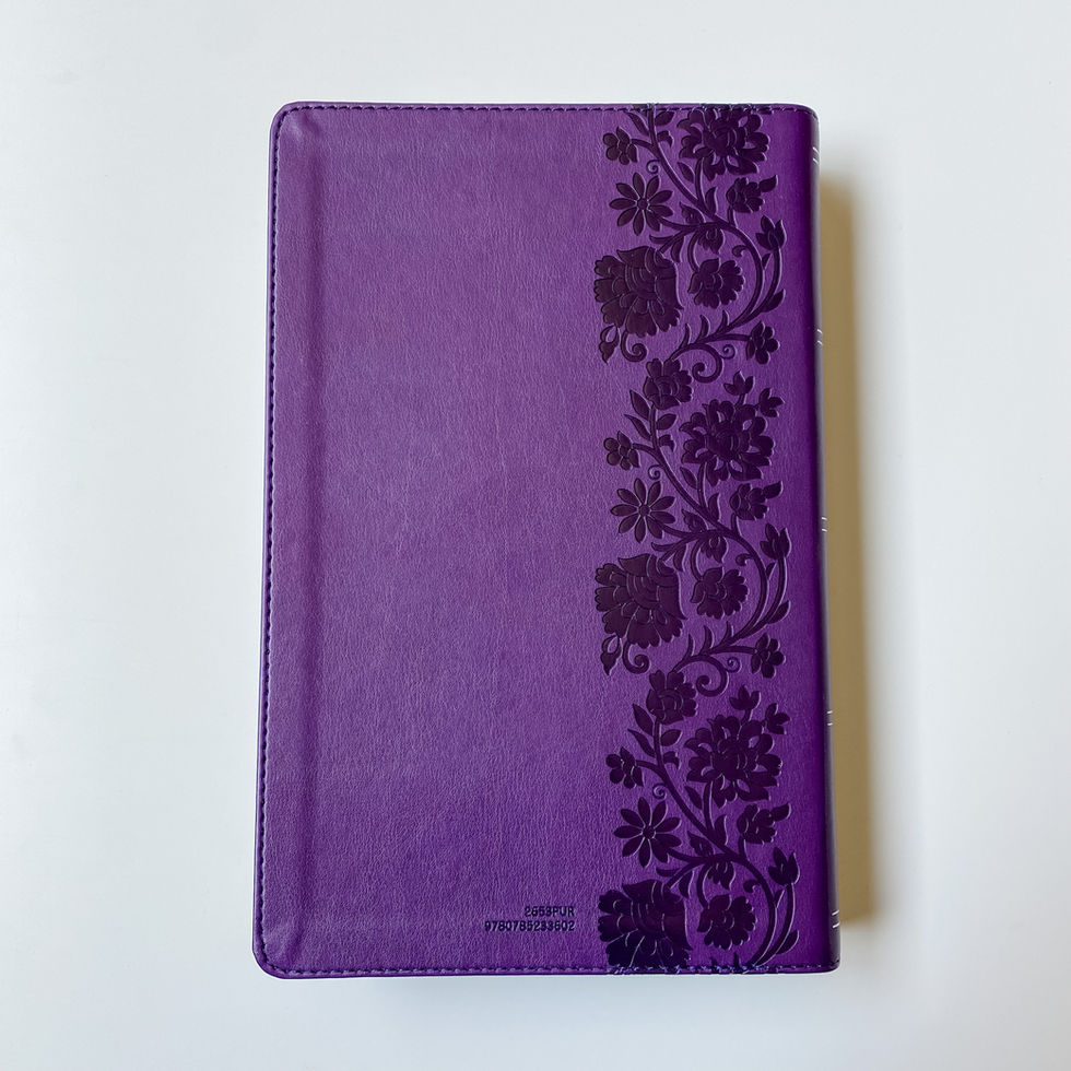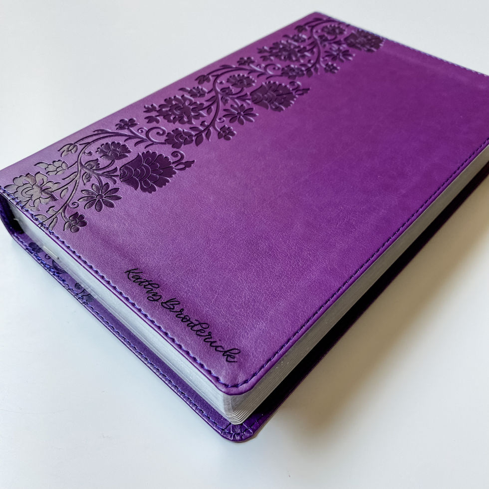 This is a purple NKJV large print Bible with Jesus' words red and a floral spine. Your purchase includes the ability to customize with a personalized, hand lettered name engraved on the lower right corner of the front cover.