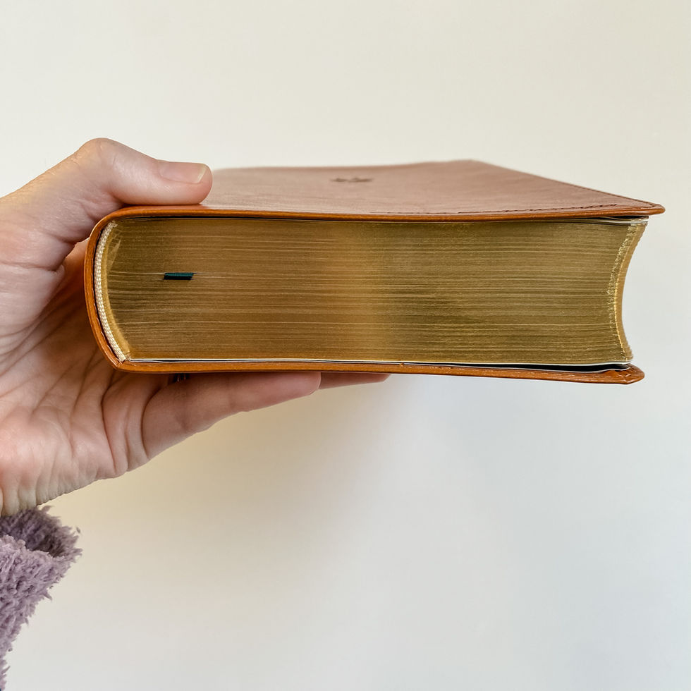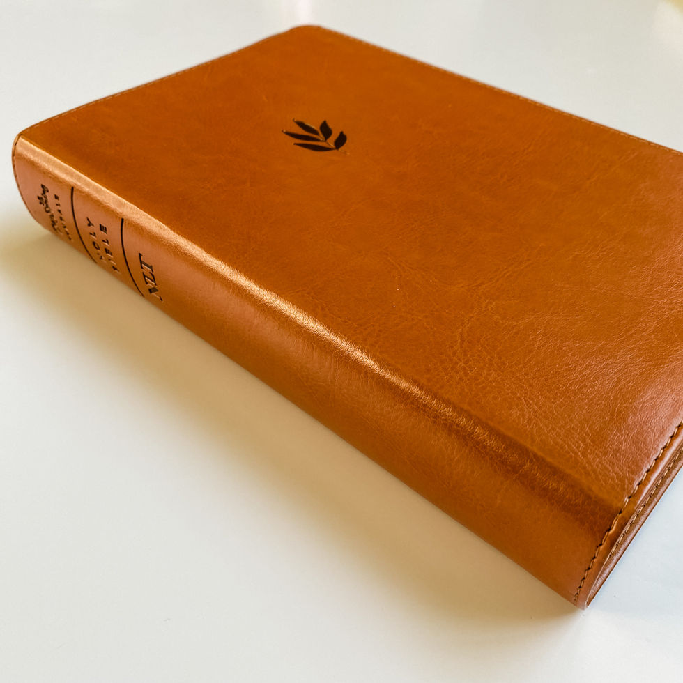 This is a personal size, giant print tan NLT Dayspring Bible with leaves on the cover.